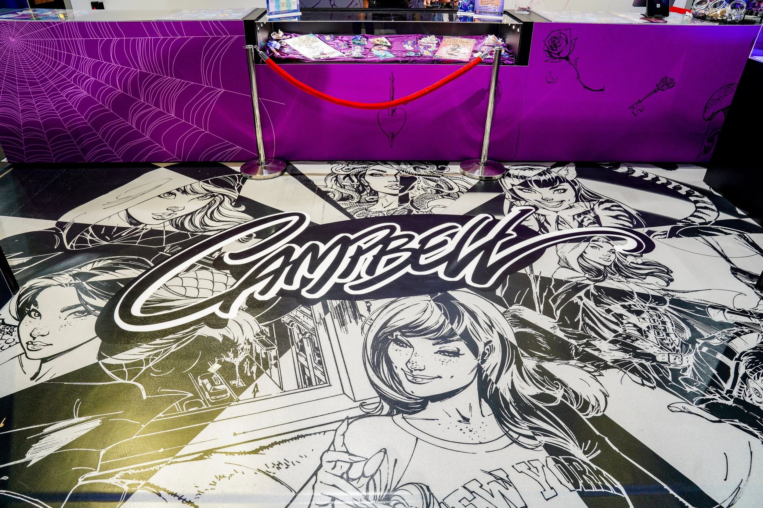 Top-selling artist J Scott Campbell asked us to bring him to the next level of exhibition. We created a space that would be typically done in a 40 x 40 and made it work in a 20 x 20! With revolutionary video screens and effects, printed floor, a suspended-lit sign, and well thought out overall design, he created waves among other artists. In 2024, we reimagined the booth with 10’ tall light boxes, newly designed black and white floor and walls, and a digital menu board.